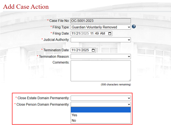 Domain Closure Options Added to Guardian Removal Case Actions When recording either the Guardian Involuntary Removed or Guardian Voluntarily Removed case action, it is now necessary to specify whether the corresponding domain is being closed permanently by selecting Yes or No. Two new fields, Close Estate Domain Permanently and Close Person Domain Permanently, display on these case actions. For each field, Yes can only be selected and saved if all guardians in the corresponding domain have been removed.