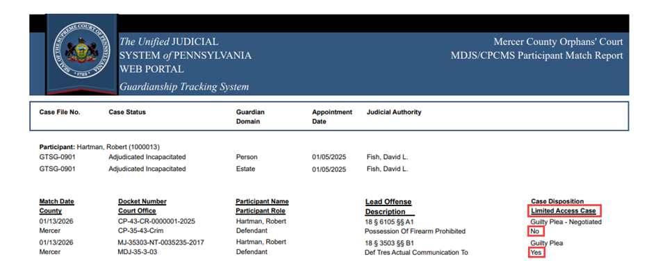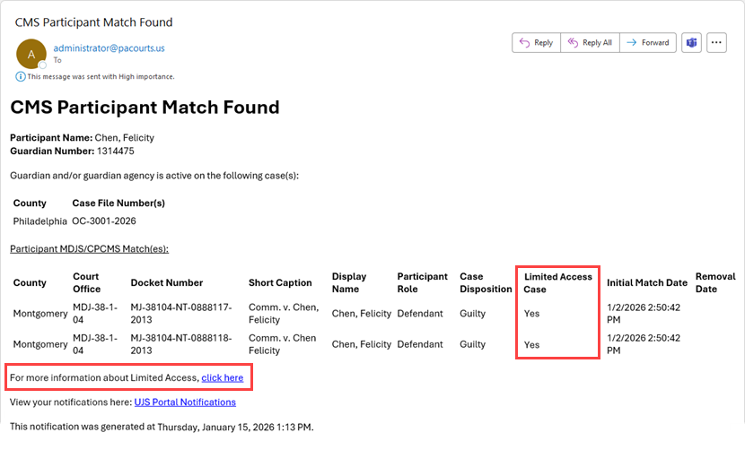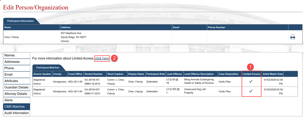 Limited Access Case Information Pennsylvania’s Clean Slate law allows certain criminal cases or offenses to be automatically sealed, or sealed after a petition is filed, once a qualifying period passes with no disqualifying activity. This action designates these cases as “limited access” in court systems. Limited access cases or offenses remain an official part of court records but are not publicly accessible, helping reduce barriers individuals may face related to employment, housing, and education. As an informational complement to the participant matching feature, which notifies you when a guardian in your county matches the primary participant on a Court of Common Pleas or Magisterial District Court case anywhere in Pennsylvania, the following updates introduce new indicators and reference information related to limited access for participant-matched cases:
